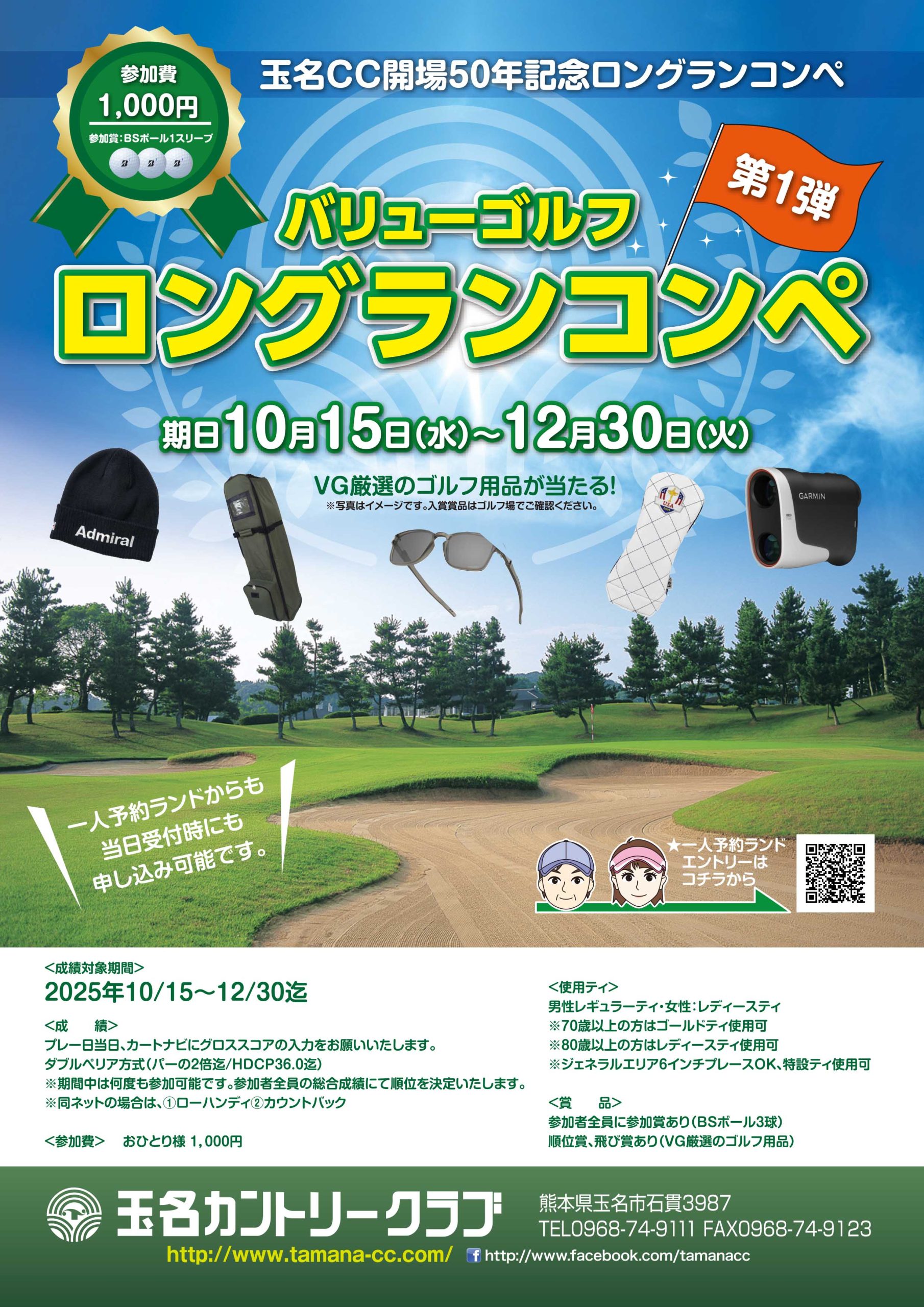 玉名CC開場50年ロングランコンペ(第一弾) 2025年10月2日 コメントはまだありません 10月15日からスタート!玉名CC開場50年ロングランコンペ(第一弾) 「バリューゴルフロングランコンペ」 ぜひ、ご参加をお待ちいたしております!